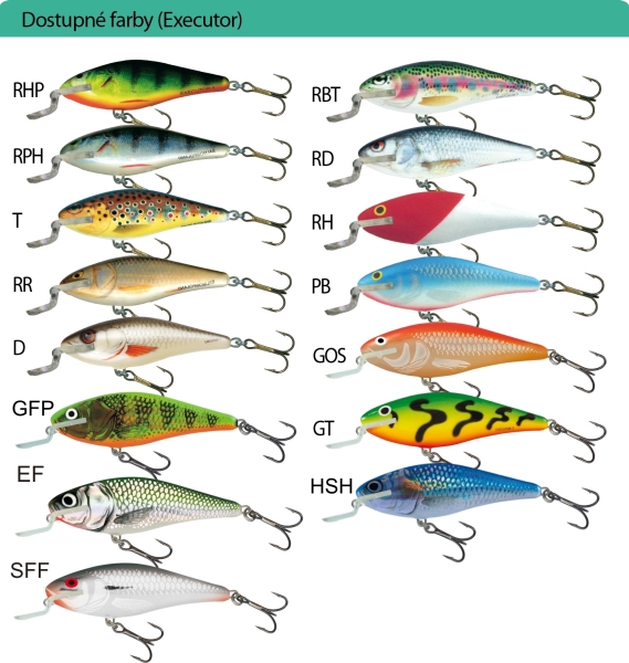 Wobler SALMO EXECUTOR, dĺžka 5 cm, váha 5,0 g, plávajúci, hĺbka ponoru 0,6/1,2 m, štíhly wobler v tvare rybky s agresívnym a plynulým pohybom, má 2 trojháčiky č.8