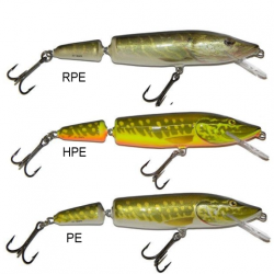 Wobler Salmo PIKE PE13JF - DVOJDIEL Wobler SALMO PIKE, dvojdielny, dĺžka 13 cm, váha 21,0 g, plávajúci, hĺbka ponoru 1,2/2,0 m, wobler imitujúci malú šťuku s agresívnym chodom a strednou akciou, má 2 trojháčiky č. 2 Woblery PIKE značky SALMO sú dlhodobo osvedčenou nástrahou na lov šťuky v jesenných mesiacoch. Predovšetkým dvojdielne modely (označené „J“ PE11J..., PE13J..) sú nazývané aj „šťučia smrť“ vďaka svojmu dráždivému pohybu pri navíjaní. Wobler PIKE = jednotka pre lov šťúk na prívlač.