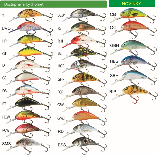 Wobler SALMO HORNET, dĺžka 3,5 cm, váha 2,2 g, potápavý, hĺbka ponoru 1,0/1,5 m. Zavalitejší wobler s agresívnym chodom a jedným trojháčikom č.10.