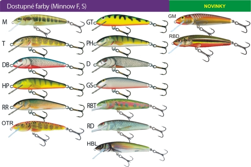 Wobler SALMO MINNOW, dĺžka 7,0 cm, váha 8,0 g, potápavý, hĺbka ponoru 1,5/2,0 m, štíhly wobler v tvare rybky s rovnomerným pohybom a menším kmitaním, má 2 trojháčiky č.5.